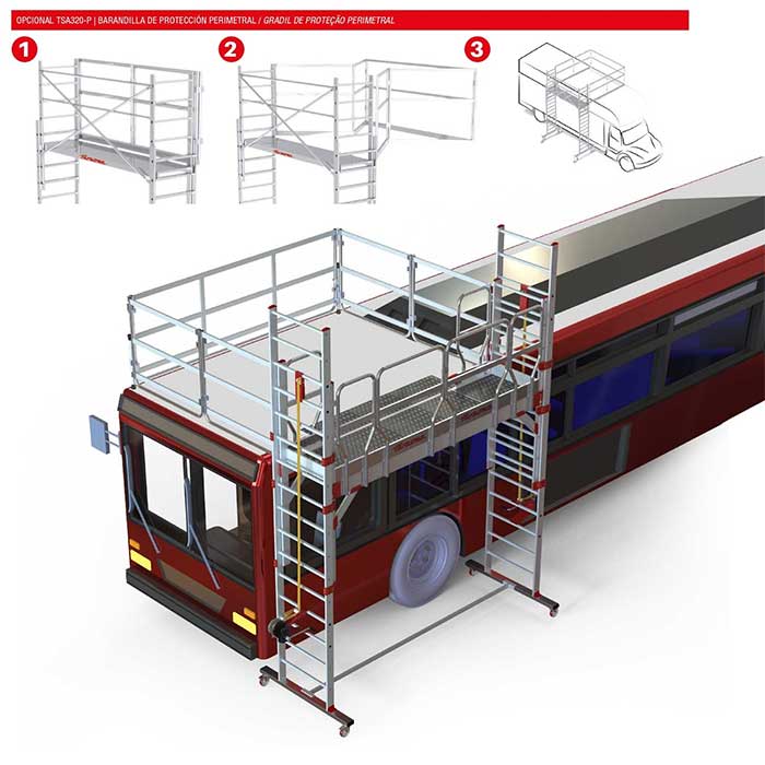 El Andamio para talleres de camiones TSA320 es un andamio regulable en altura mediante doble cabrestante, diseñado para realizar trabajos de mantenimiento de forma segura en camiones, autobuses, remolques, cisternas y cabezas tractoras. Su diseño permite acceder cómodamente a zonas elevadas, como el techo de los vehículos, con total estabilidad.