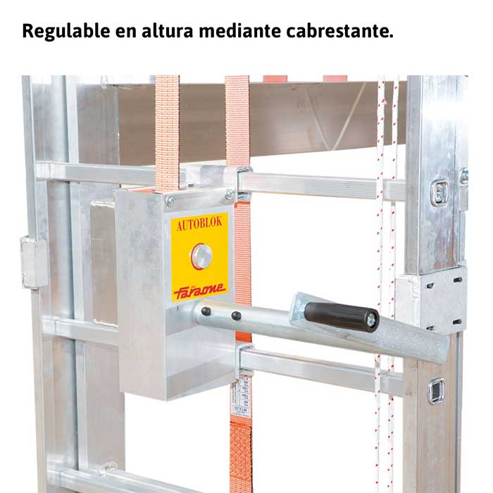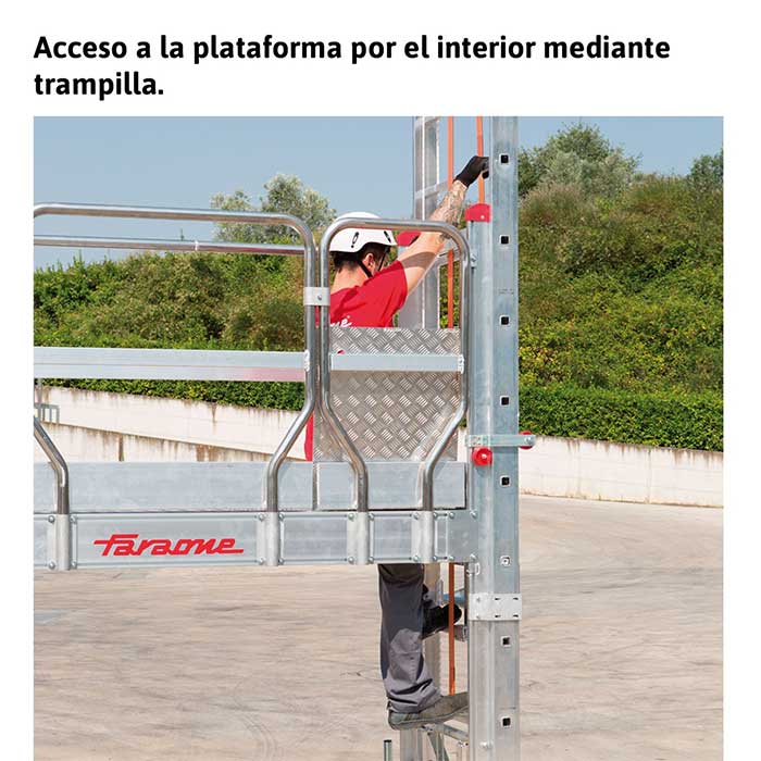 El plano de trabajo incorpora una trampilla de seguridad que permite el acceso desde el interior del andamio, aumentando la seguridad del operario. El sistema de doble cabrestante con manivela permite subir y bajar el plano de trabajo sin esfuerzo, con posibilidad de regular la altura cada 30 cm, adaptándose a diferentes necesidades de trabajo.