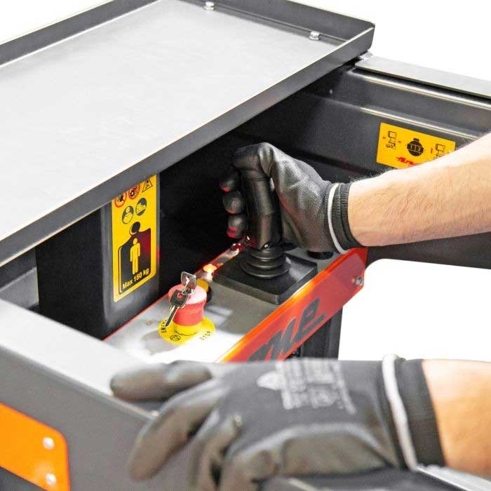 Gracias a su diseño compacto, puede desplazarse por pasillos y accesos estrechos de tan solo 95 cm, facilitando su uso incluso en áreas congestionadas. Su radio de giro cero y el control mediante joystick con una sola mano ofrecen una maniobrabilidad excepcional, reduciendo tiempos de trabajo y aumentando la productividad.