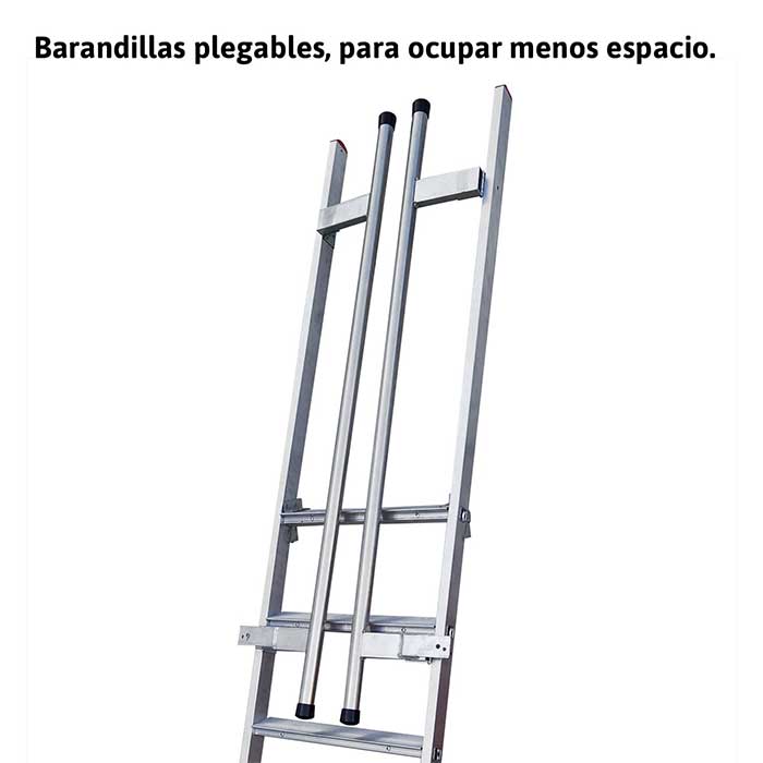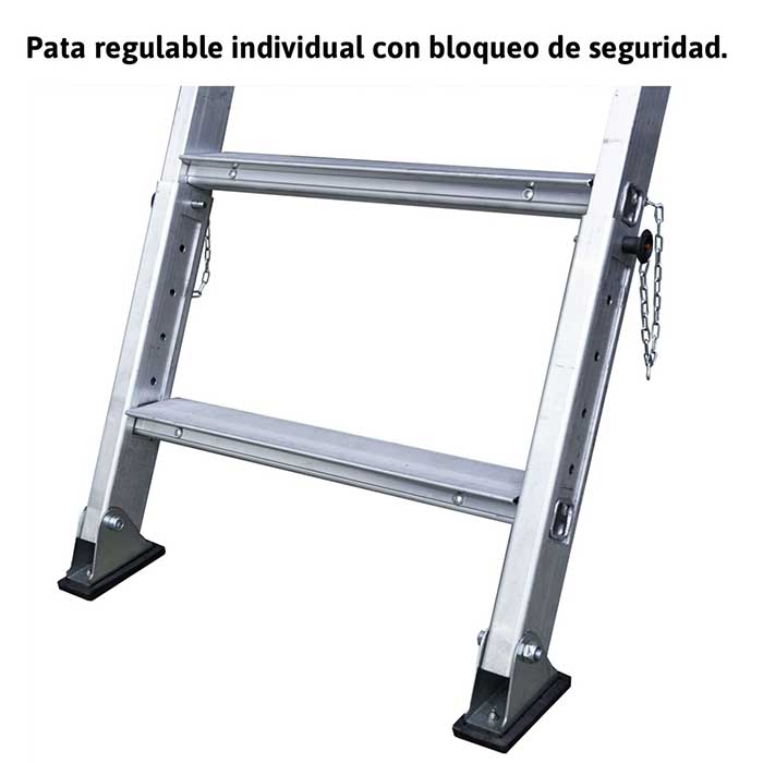 Cuenta con patas regulables individualmente con bloqueo de seguridad, lo que permite adaptarla a superficies irregulares y mantenerla estable en todo momento. Sus peldaños antideslizantes de 8 cm de profundidad proporcionan un apoyo firme y seguro, mientras que las barandillas de seguridad plegables ocupan menos espacio cuando no se utilizan.