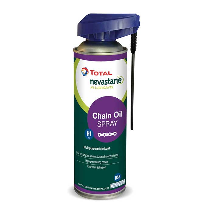 NEVASTANE CHAIN OIL SPRAY es un lubricante en aerosol de alta adherencia con propiedades antidesgaste y extrema presión, diseñado para aplicaciones industriales con contacto accidental con alimentos. Gas propulsor no inflamable y actuador seguro para prevenir contaminación.