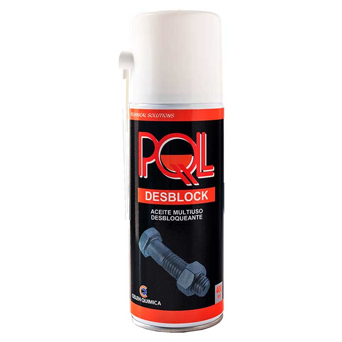 PQL Desblock es un fluido multiuso aflojatodo especialmente desarrollado para liberar mecanismos agarrotados, lubricar partes móviles y proteger de la corrosión piezas metálicas.