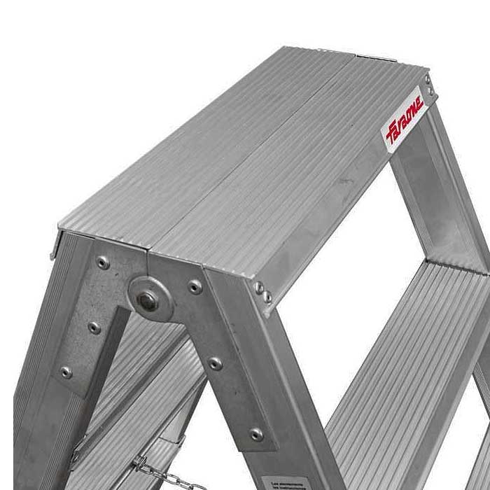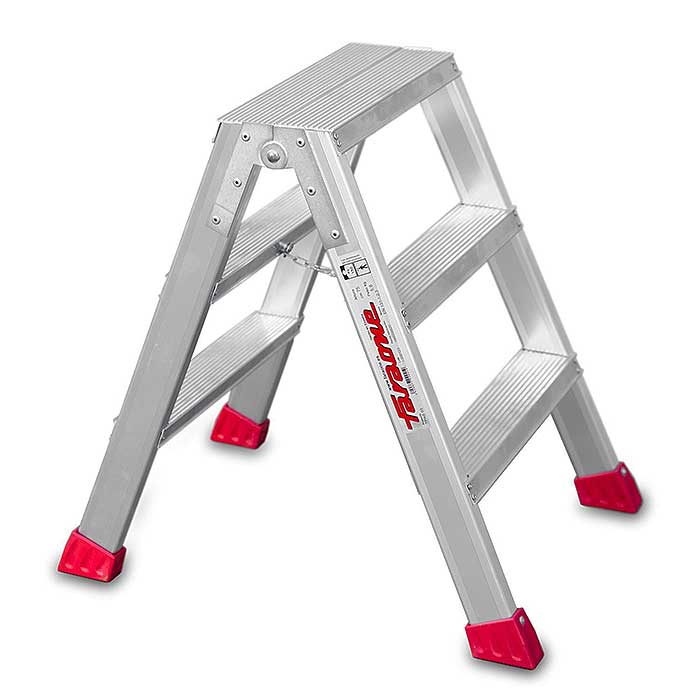 Taburete de doble subida TPAS de aluminio con bisagras reforzadas, sistema anti cierre seguro, peldaños de 8 cm y tacos de goma antideslizantes para máxima estabilidad, disponibles en versiones 2+2 peldaños, 3+3 peldaños y 4+4 peldaños
