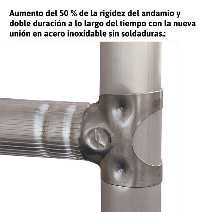 El andamio TOP SYSTEM está fabricado en aluminio extruido con un espesor mínimo de 1,5 mm. Este tipo de aluminio ofrece mayor elasticidad en comparación con los materiales electrosoldados, proporcionando resistencia superior y reduciendo el riesgo de colapsos estructurales imprevistos.