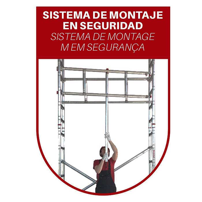 El andamio TOP SYSTEM 135, con sistema de montaje seguro, incorpora un nuevo sistema de instalación que permite montar la barandilla desde abajo, de manera que el operador accede al área de trabajo ya completamente protegida, minimizando al máximo el riesgo de caída desde altura.