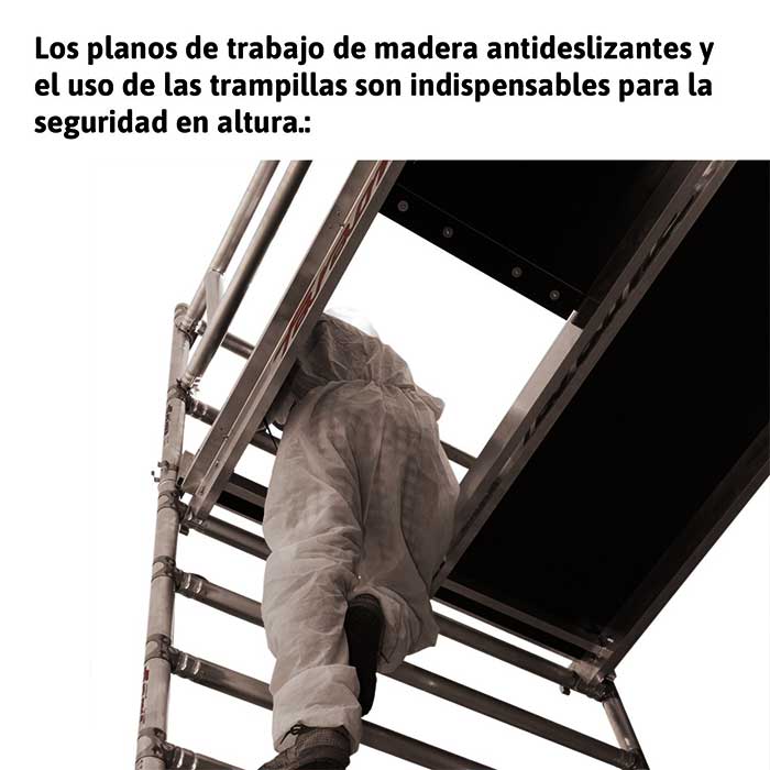 La subida es más cómoda gracias a la menor distancia entre peldaños, con 7 peldaños por cada lateral en lugar de los 6 habituales en andamios convencionales, facilitando un ascenso más seguro y ergonómico.