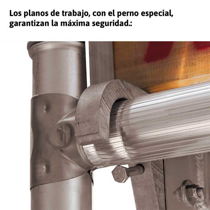 Las plataformas de trabajo cuentan con una estructura de aluminio de alta resistencia y grandes ganchos de apoyo, capaces de soportar incluso golpes accidentales. El zócalo está fabricado en aluminio y el tablero en madera contrachapada con tratamiento fenólico, ofreciendo resistencia al agua y durabilidad.